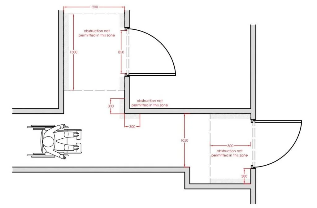 The turning diameter of a person in a wheelchair is 1500mm. A wheelchair person passing through a corridor is 1800mm.